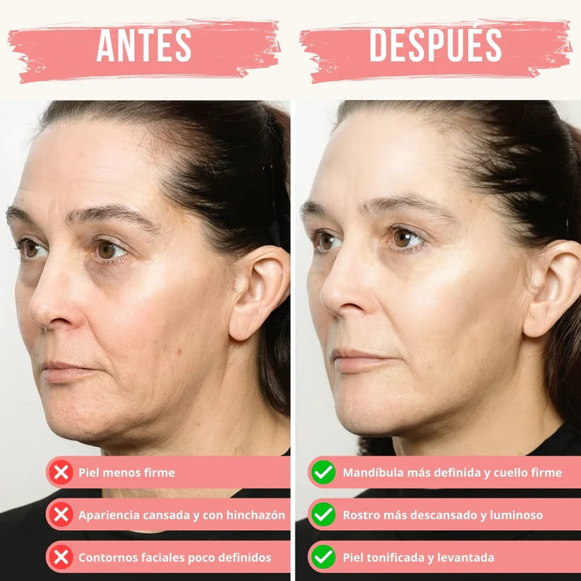 Con solo 5 minutos al día, notas un efecto inmediato de tonificación y luminosidad. Y con el uso regular, la piel recupera firmeza, elasticidad y un contorno facial más definido.