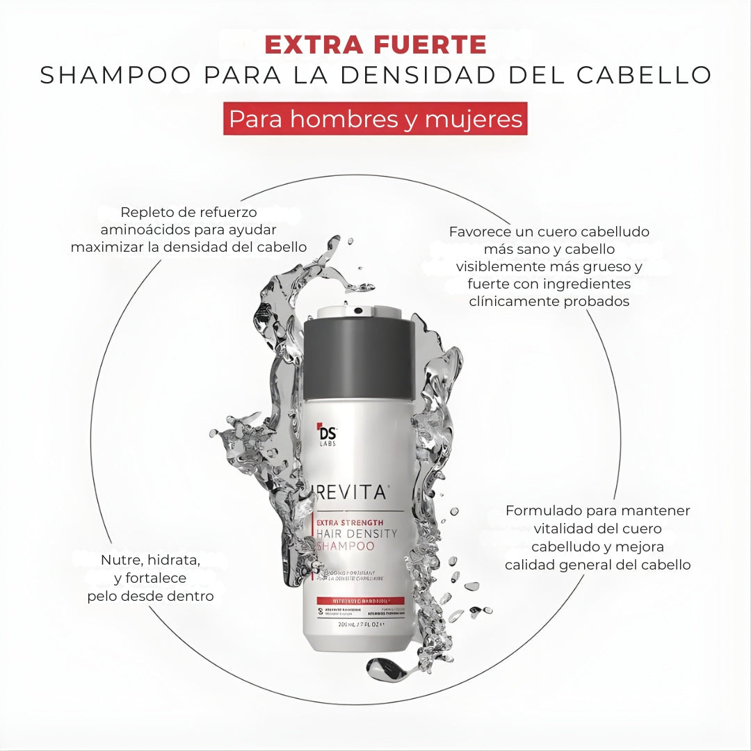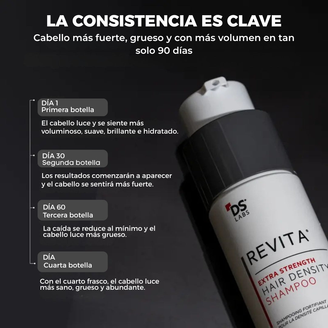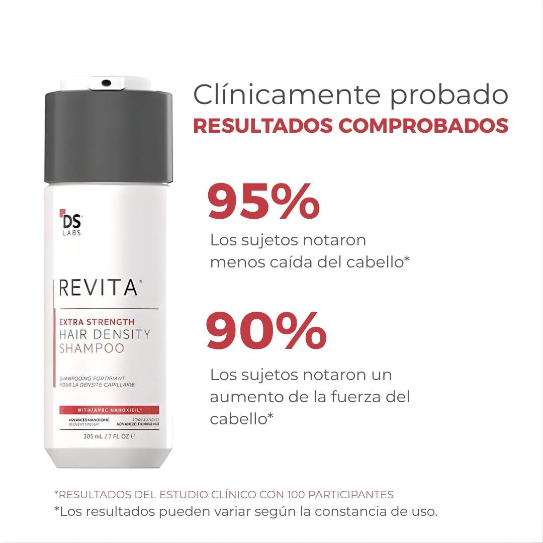 Más que un champú, Revita es un tratamiento capilar respaldado por investigación científica. Su fórmula combina extractos naturales como saw palmetto, té verde, árnica y castaño de Indias con moléculas de alta eficacia como el Nanoxidil® y la niacinamida, que actúan en conjunto para mejorar la densidad, estimular el crecimiento y reducir los signos de debilitamiento.