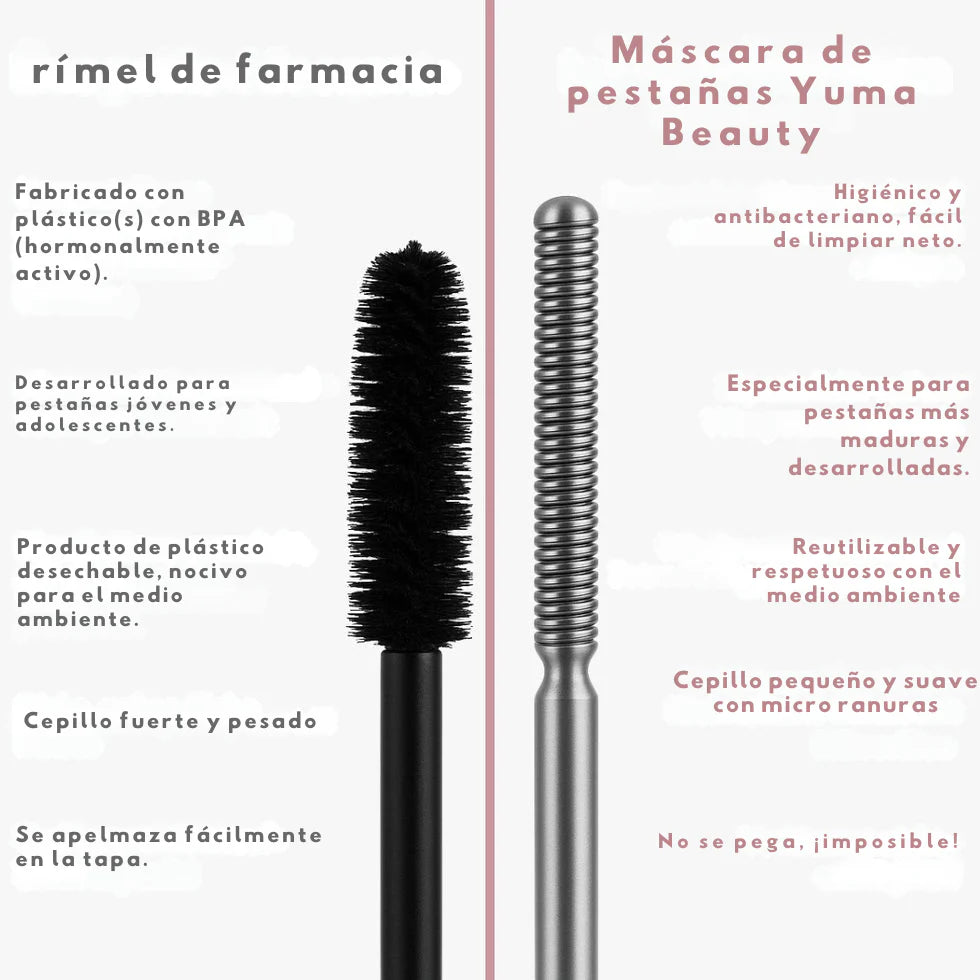 Su fórmula está elaborada con ingredientes naturales y aceites vegetales que nutren y reparan las pestañas desde la raíz, mientras su cepillo metálico reutilizable separa y define sin apelmazar.